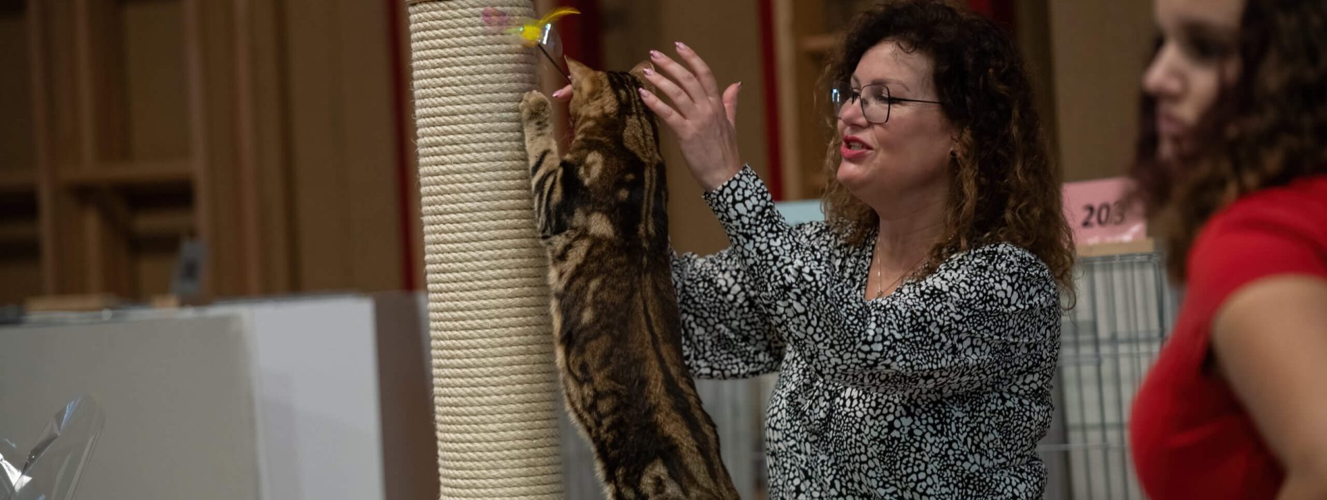 Frau spielt mit einer Katze auf einer Katzenausstellung, Kratzbaum im Hintergrund.